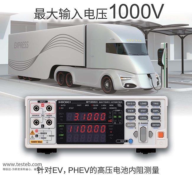日置HIOKI BT3564高壓電池測(cè)試儀適用于從針對(duì)高壓化的EV、PHEV到住宅用蓄電池等多種電池組出入貨檢查,最大輸入電壓1000V(BT3563測(cè)試儀最高300V),能夠直接測(cè)量之前無(wú)法測(cè)量的300V以上的電池組的內(nèi)阻,可同時(shí)測(cè)量?jī)?nèi)部電阻和電池電壓。日置BT3564電池測(cè)試儀電阻測(cè)量量程0.1mΩ~3kΩ,分辨率 0.1 µΩ~0.1 Ω,精度±0.5%,電壓測(cè)量DC 10V~1000V,分辨率 10µV至1mV,準(zhǔn)確度±0.01% rdg. ±3 dgt,搭載高壓測(cè)試防火花功能,安全并迅速的測(cè)量高壓電池組。搭載電阻測(cè)量值的模擬輸出功能,通過(guò)記錄儀和數(shù)據(jù)采集儀組合使用,能夠長(zhǎng)時(shí)間監(jiān)測(cè)總電阻值的情況。