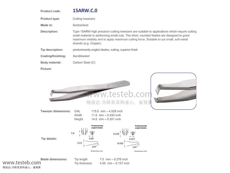 功能參數(shù)簡介:Ideal-tek 15ARW剪切鑷子采用碳鋼材質(zhì)制造,刀刃具有60HRC高硬度,短窄圓弧面頭部提供良好的操作視野和高強度切割力,用于0.25mm線徑以內(nèi)電子級別細線導(dǎo)絲、游絲、軟磁線等切割修剪,訂貨代碼15ARW.C,swiss made瑞士制造。