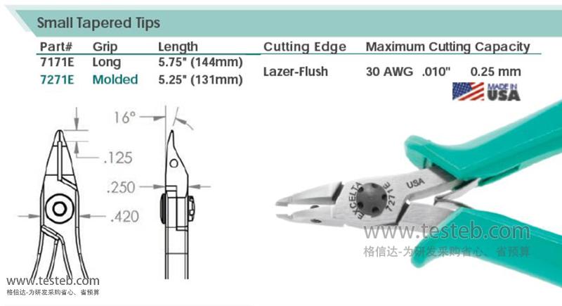 美國(guó)Excelta 7171E尖口鉗細(xì)錐形鉗頭適合在狹小空間精細(xì)點(diǎn)剪切修絲操作,對(duì)0.25mm線徑以內(nèi)細(xì)線精細(xì)剪切修絲,切口斷面完全齊平效果Lazer-Flush,符合人體工程學(xué)設(shè)計(jì)的軟性泡沫材質(zhì)雙色手柄ESD防靜電,質(zhì)量等級(jí)5五星。規(guī)格資料文檔http://www.testeb.com/download/202307/Excelta_7171E_datasheet.pdf。